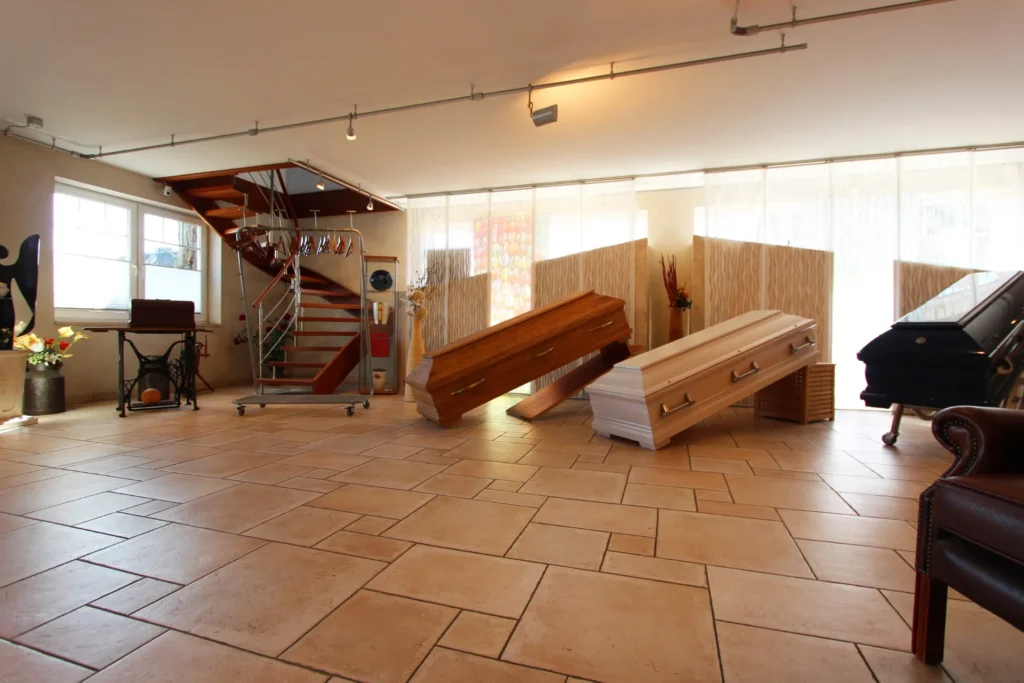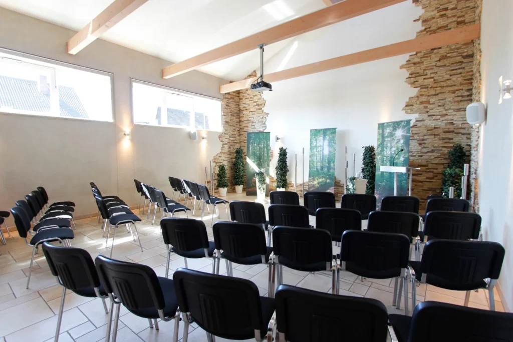 Bei der Gestaltung unserer modernen Räumlichkeiten haben wir neben der Funktionalität sehr viel Wert auf eine familiäre, warme Atmosphäre gelegt mit heller Farbgebung. Hier können Sie gemeinsam mit uns in aller Ruhe alle wichtigen Details besprechen, Abschied nehmen und auch die Trauerfeier würdevoll begehen. Selbstverständlich sind die Räumlichkeiten behindertengerecht und barrierefrei gebaut.